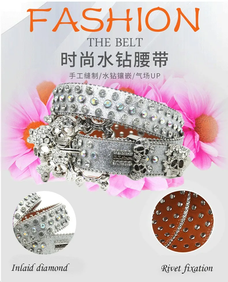 The water diamond belt is made of zinc alloy buckle. A-grade glass diamond. PU material. iron bead chain composition and rivets. purely handmade. directly sold by the manufacturer. and supports customized drawings