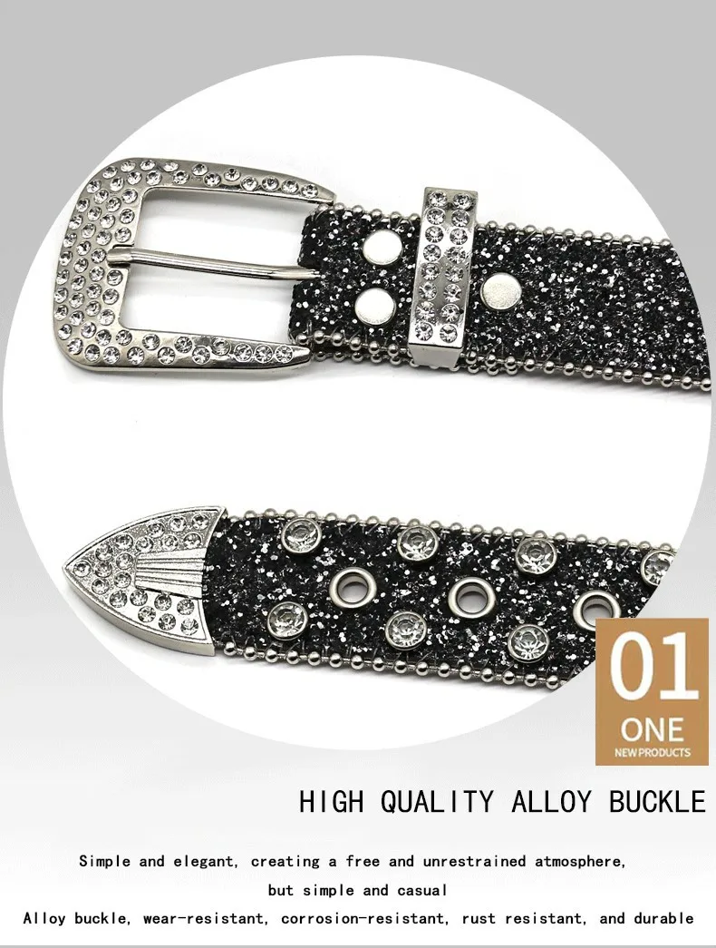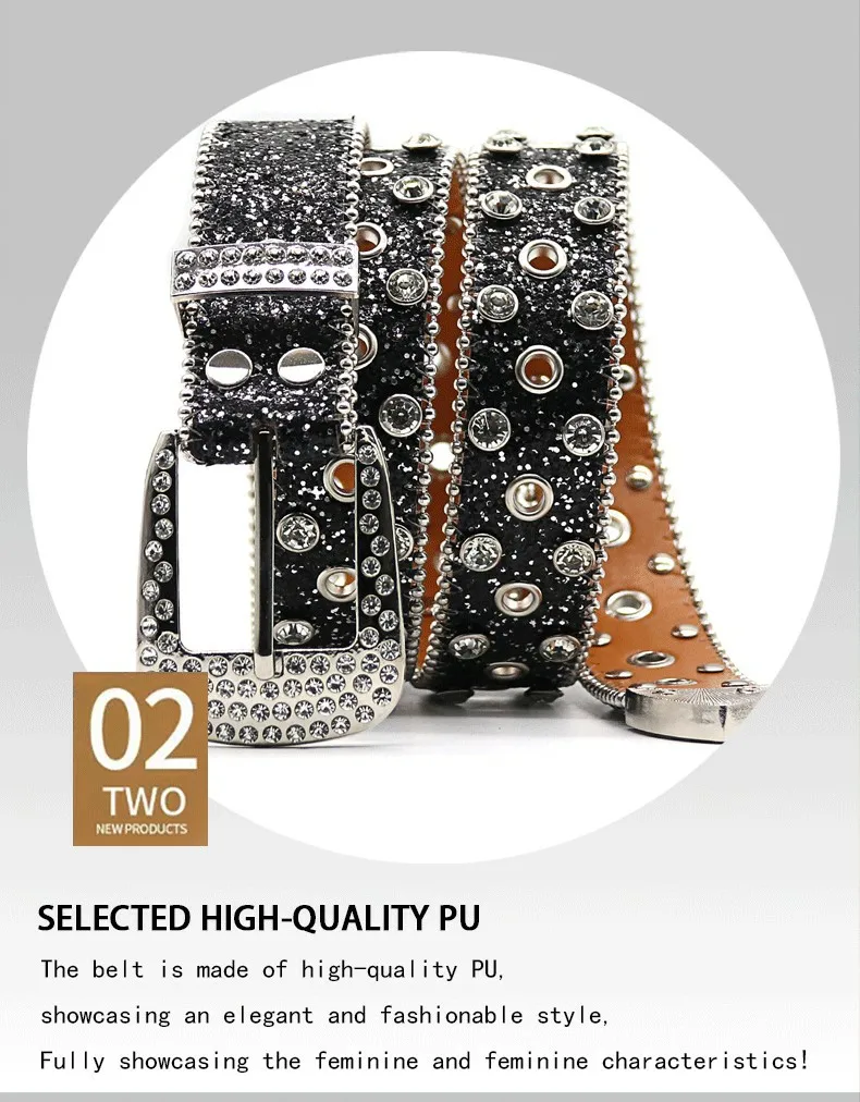 The water diamond belt is made of zinc alloy buckle. A-grade glass diamond. PU material. iron bead chain composition and rivets. purely handmade. directly sold by the manufacturer. and supports customized drawings